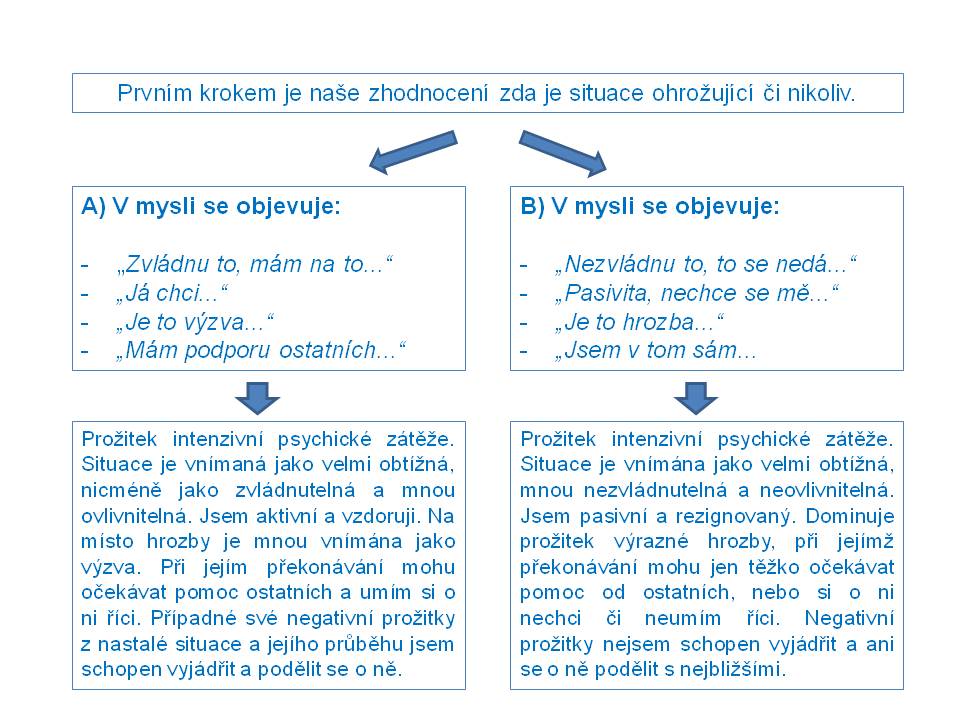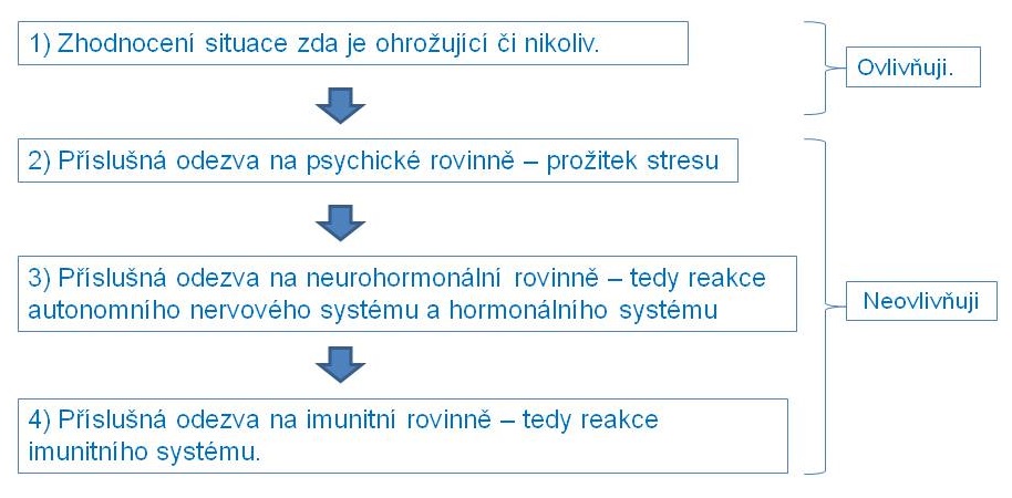 Je tedy do určité míry na nás, jak působící situaci zpracujeme a jaký postoj k ní z dlouhodobého pohledu zaujmeme. Pokud budeme situaci i nadále prožívat jako neřešitelné stresující trápení, proběhnou velmi pravděpodobně všechny ostatní fáze (bod 2 až 4 výše uvedeného schématu). Ty jsou ve většině případů jen automatickými biologickými reakcemi, které vycházejí s prvotního podnětu v podobě našeho prožitku.